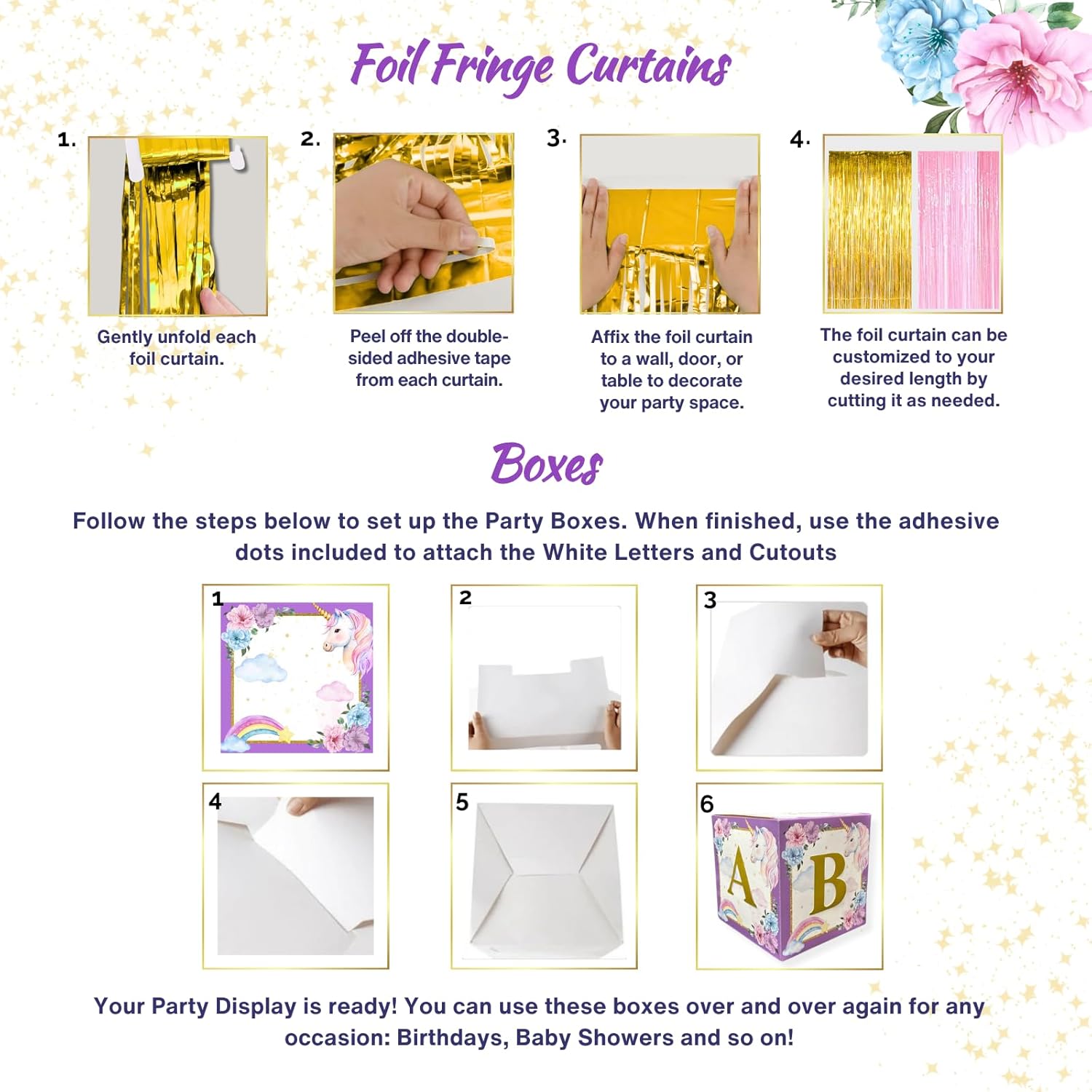 | Included Components | 1 x "Birthday Girl" Satin Sash; 1 x Unicorn Crown; 100 x Unicorn Confetti, 1 x "Happy Birthday" Unicorn Cake Centerpiece; 5 x Cake/Cupcake-Toppers, 1 x Happy Birthday Premium Oxfor Cloth Backdrop; 2 x Pink and Gold Foil Fringe Curtains, 120 x Latex Balloons, 6 x Star Foil Balloons; 1 x Unicorn Foil Balloon, Balloon Arch Assembling Kit, 5 x Cardstock Party Boxes; 2 sets of Gold Glitter "A-Z" letters; 2 x Gold Glitter Cutouts: Star and Heart |