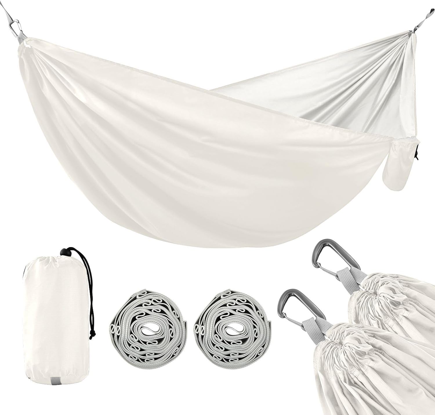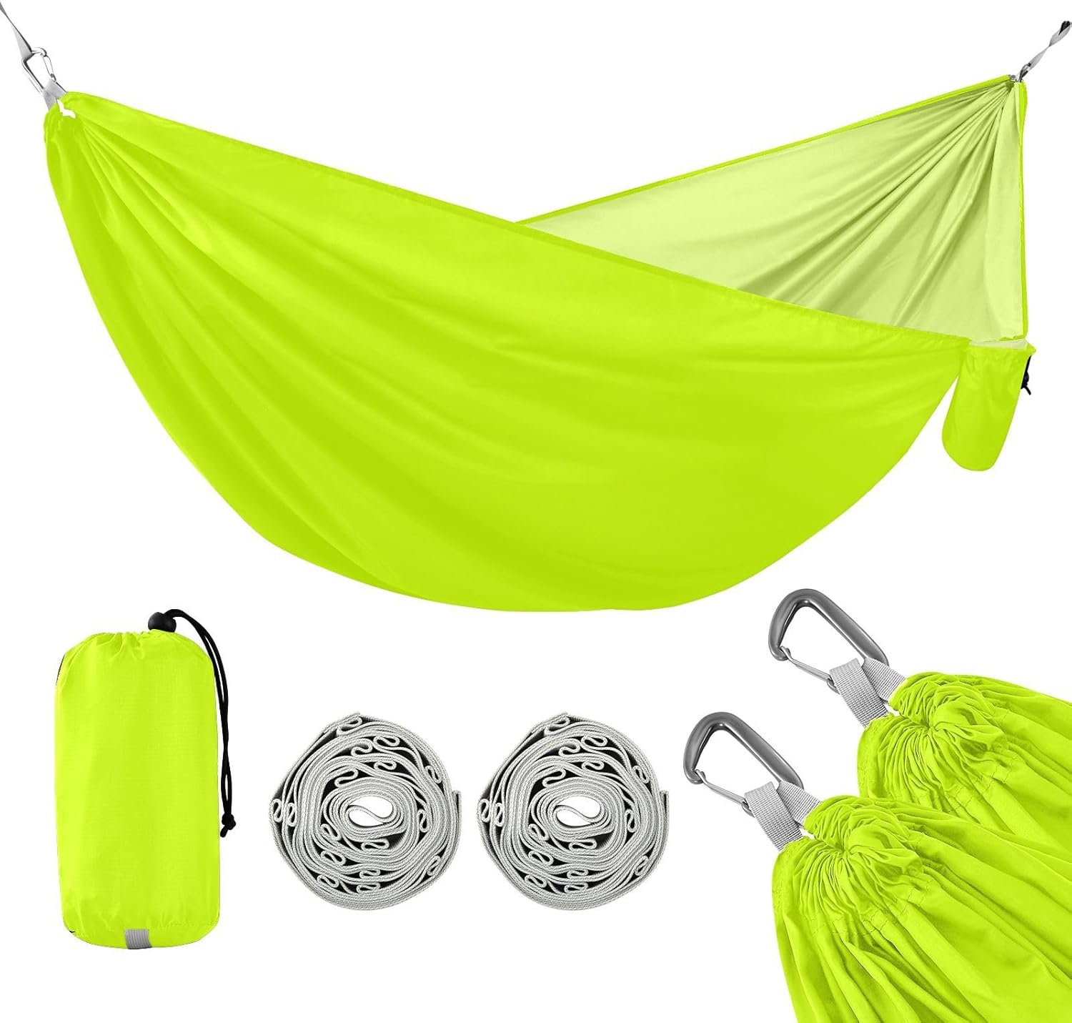 Discover the freedom of outdoor relaxation with this high-performance camping hammock — engineered for strength, built for comfort, and designed for adventure.Heavy-Duty Polyester MaterialMade from& polyester material, the hammock body features high-strength 210T taffeta fabric—lightweight, tear-resistant, and breathable. It provides long-lasting durability and supports up to 390 lbs (183 kg), making it ideal for any outdoor environment.Reinforced Suspension SystemThis camping hammock comes with two 2-meter high-density 600D tree straps and durable aluminum alloy carabiners. Each strap features multiple loops for fast, knot-free setup and easy height adjustment—hang it anywhere in minutes.Spacious Yet PortableMeasuring 114" × 54.3", this single-person outdoor hammock offers plenty of room to stretch out and relax. Despite its generous size, it weighs only 490g and folds into a compact pouch—Suitable for backpacking, hiking, or minimalist travel.Built-in Storage PocketStay organized while you unwind. A convenient side pocket is built into the hammock to hold small items like your phone, flashlight, or snacks—no need to dig through your backpack.Made for All Outdoor ScenariosWhether you're camping in the woods, trekking through the mountains, chilling at the beach, or relaxing in your backyard, this portable camping hammock is your go-to gear. Machine washable for easy care—just remove carabiners and bag the straps before washing.From weekend getaways to rugged expeditions, this Double Person Hammock delivers comfort, strength, and convenience in one ultra-portable package. Wherever you go, hang with confidence.