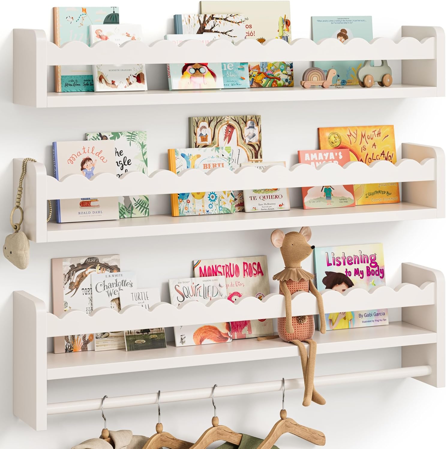 Bring a touch of enchantment and order to your little one’s space with our charming Scalloped Floating Wall Shelves. Designed specifically for nurseries and toddler rooms, these wooden shelves blend delightful aesthetics with practical functionality, creating the perfect spot to display your child’s favorite treasures and encourage early literacy. Crafted from premium, sturdy wood with a smooth, non-toxic finish, each shelf is built to be safe and durable for your family. The standout feature is the beautifully crafted scalloped front edge—a sweet, wave-like detail that transforms a simple shelf into a piece of magical wall decor. This lovely design adds a soft, whimsical touch to any room theme, from boho to modern. More than just pretty decor, these shelves are incredibly practical. The raised lip of the scalloped edge acts as a gentle barrier, securely holding board books, small plush toys, keepsake boxes, or mini potted plants in place, preventing accidental slips. Measuring 16.5 inches in length, each shelf offers ample space to organize and rotate displays, helping to keep the floor tidy while making storytime picks easy and accessible. Installation is quick and straightforward, with all necessary hardware and clear instructions included. Mount them in a playful cluster, line them up above the changing table, or create a dedicated reading nook. They make a wonderful and thoughtful gift for baby showers, birthdays, or housewarmings. Features: Whimsical Scalloped Design: The unique curved front adds a cute, decorative border, turning functional storage into a charming nursery accent. Safe & Sturdy Build: Made from high-quality solid wood with a child-safe, smooth finish. Securely mounted to the wall to hold books and lightweight toys with stability. Perfect Nursery Organizer: Ideal for displaying baby books, small stuffed animals, decorative bins, or diaper cream essentials—keeping necessities within reach but neatly stored. Easy Wall Mounting: Comes with complete installation kit. Easily create a custom gallery wall or a sweet, space-saving storage solution in minutes. Versatile Gift-Ready Decor: A delightful addition to any child’s room, playroom, or as a unique shelf in a bathroom or hallway. Beautifully packaged, ready to gift for any special occasion.