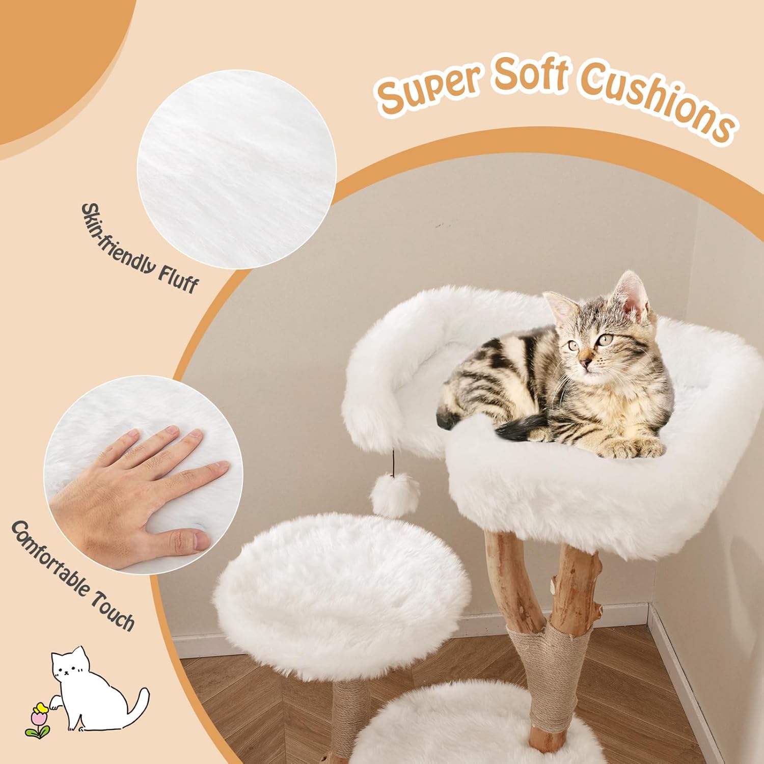 • [Comfy Lying Space]: Each platform of this wooden cat tree is draped in luxuriously long plush fabric, creating a soft, skin-friendly surface that your cat will love. The ultra-cozy cushions add an extra layer of warmth, providing the perfect spot for a restful nap, a snug curl-up, or playful moments of joy.